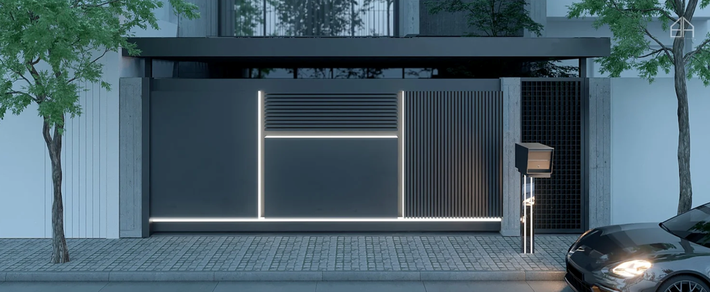 The electronic sliding gate is constructed from premium aluminum and integrates a warm white 3,000K LED lighting system. The embedded illumination is entirely concealed within the aluminum framework, producing a soft internal glow that transforms the utilitarian gate into a visual centerpiece.