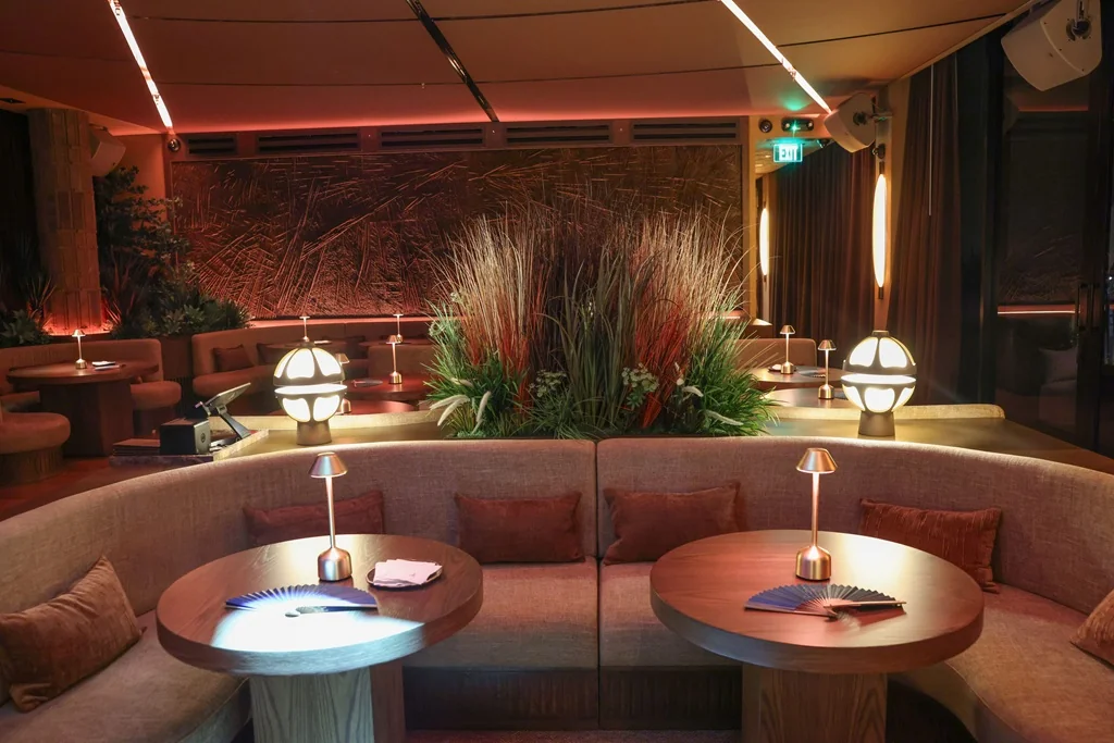 Inside CASA NEOS Lounge, plush banquettes and intimate seating invite lingering conversation, while floor-to-ceiling windows frame the glowing Miami skyline. Sculptural lighting, textured finishes, and warm woods create a quietly luxurious atmosphere. Soft candlelight flickered across tables, casting a golden glow over curated bites by Chef Michaël Michaelidis and signature cocktails by Clase Azul, inviting guests to linger in the intimate, layered environment.