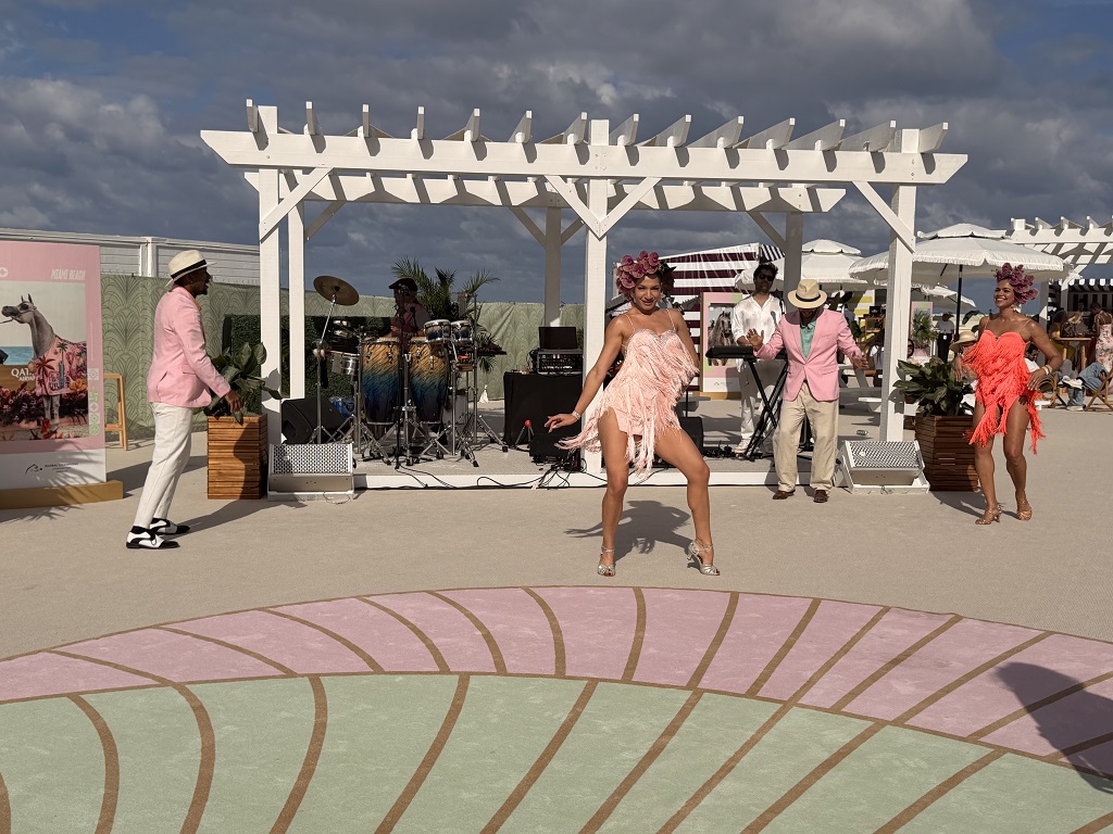 Entry into the grounds unfolded as a singular, uninterrupted tableau. Attendees arrived impeccably attired, drawn from both Miami’s established circles and international contingents flown in for the weekend’s staging, where sport and social distinction coalesced with understated ease. A live Latin ensemble lent rhythm to the threshold of arrival, where a few briefly joined dancers before proceeding inward. Nearby, cigar rollers worked with unhurried dexterity, the entire scene imbued with a sunlit, tropical languor evocative of a coastal enclave suspended between Havana’s nostalgia and Miami’s polished restraint.